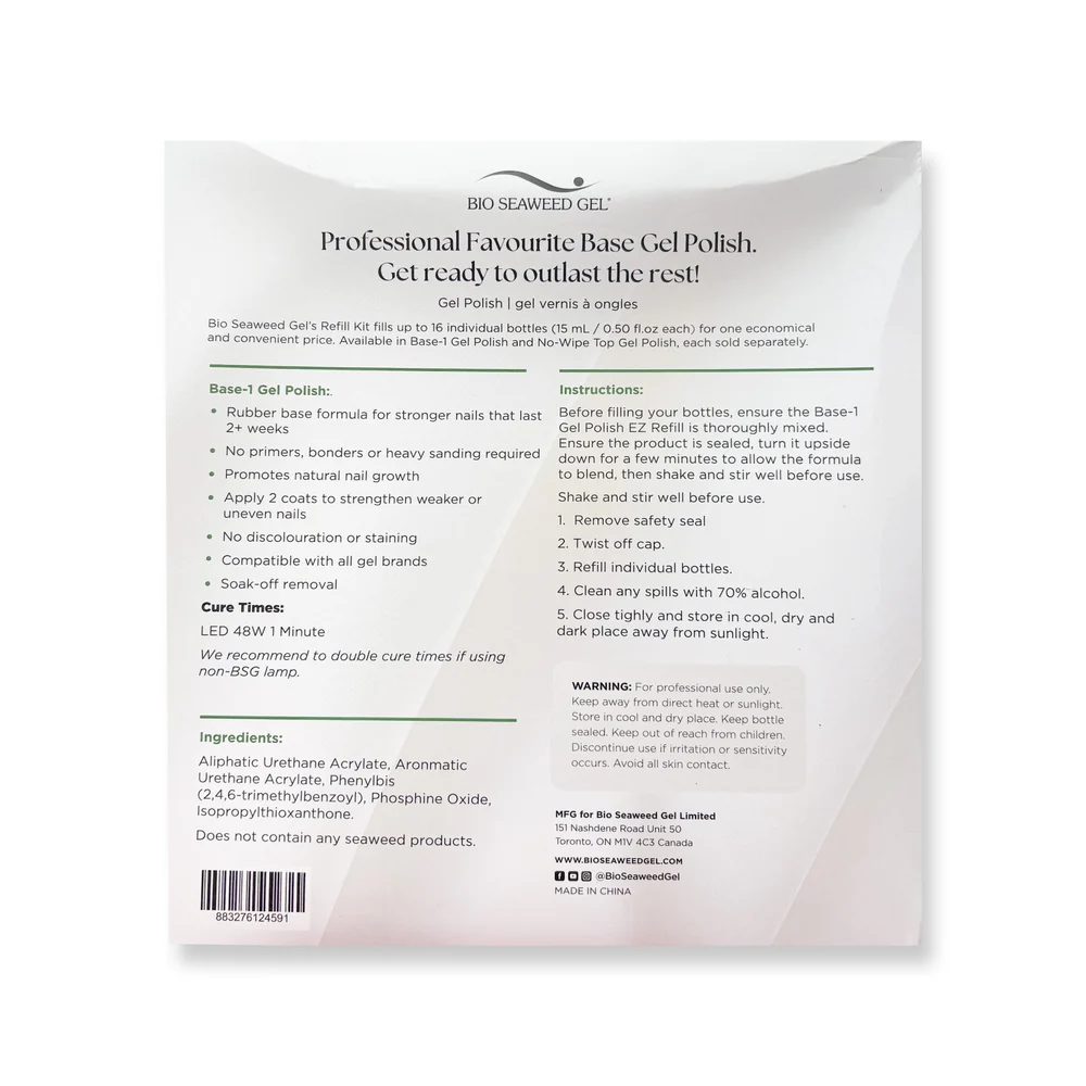 Convenient 250mL refill bottle fills up to 16 x 15mL individual bottles. This kit includes 3 x ready-to-fill empty 15mL bottles.Strengthen your gel nails with our upgraded extra strength Base-1 Gel Polish.New and improved rubber base formula for a stronger wear and quicker soak-off time. Ideal for all types of nails, including weak to brittle nails.Benefits: