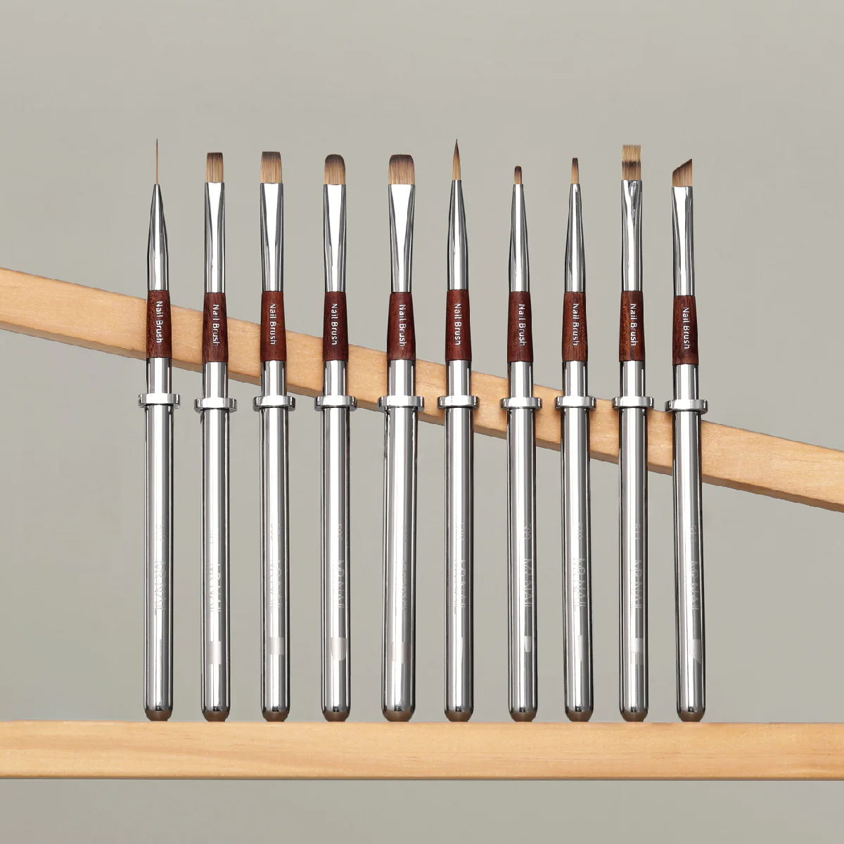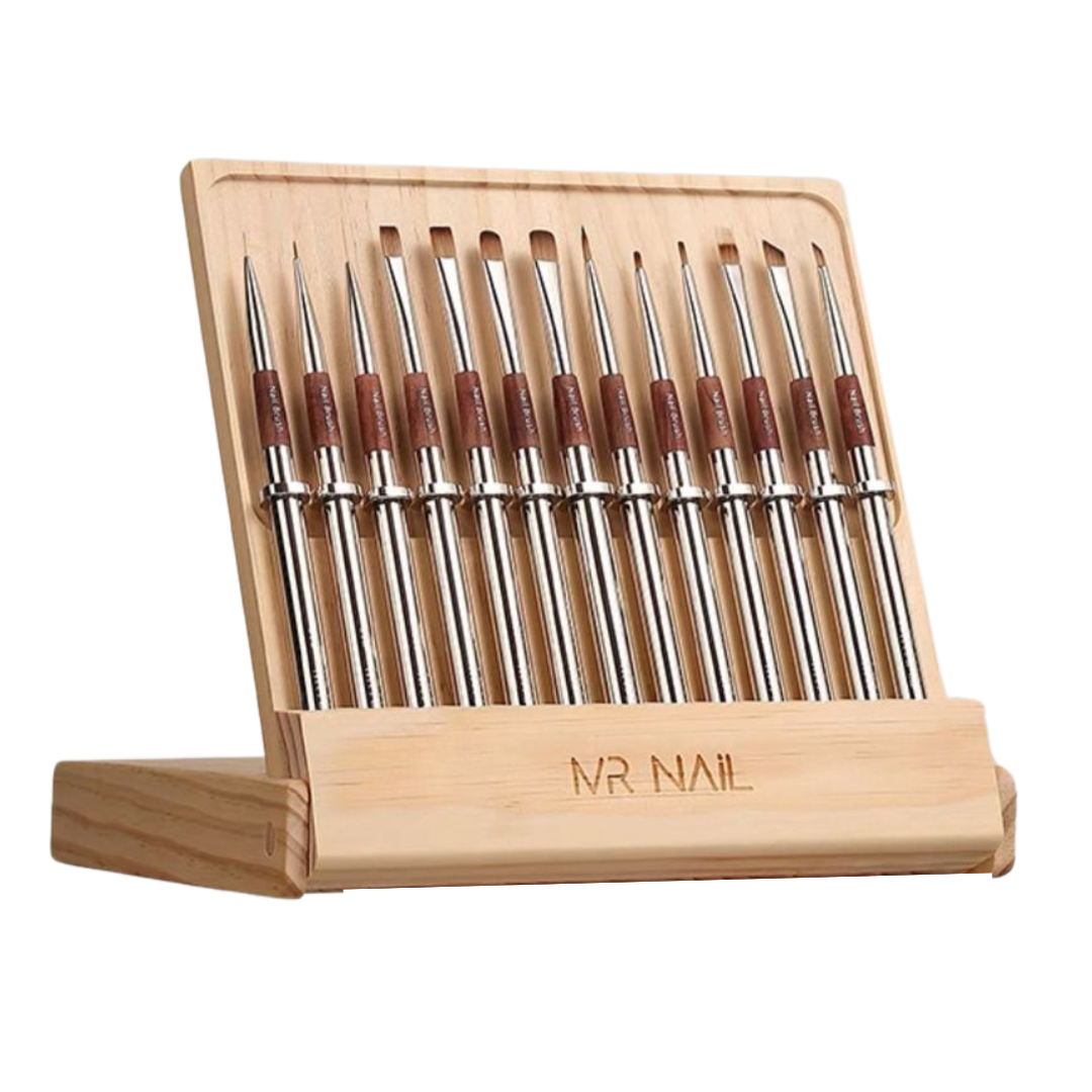 The Mr. Nail Professional Brush Set (13pcs) is a meticulously crafted collection designed to elevate your nail artistry. Each brush is constructed with premium pear wood handles and copper ferrules, ensuring durability and a luxurious feel. The set features an innovative center rim that keeps brushes elevated, preventing them from rolling off surfaces and maintaining cleanliness. Clear brush tip icons and engraved numbering on both the caps and handles allow for easy identification and selection during your creative process.
